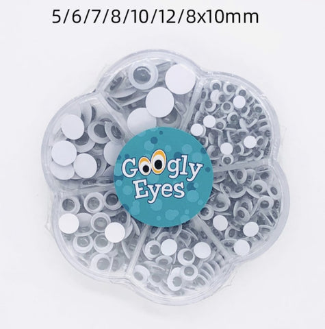 Googly Eyes Box - Round Black : SKU GE-RBK (Approximately 470 pcs) Self Adhesive Round Eyes of: 5mm x 185pcs, 6mm x 100pcs, 7mm x 80pcs, 8 mm x 60pcs, 10mm x 25pcs, 12mm x 20pcs. Googly Eyes...