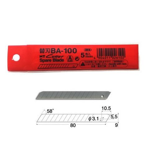 NT® Cutter Blade is a Japan blade Use for various purposes: office, school, craft, industrial uses, etc Use as replacement blade for 9mm blade cutter Packing : 5 blades/OPP bag