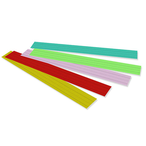 Five assorted colors of Rainbow® Kraft Paper converted into 3" x 24" sentence strips with 1.5" ruling and 0.75" dotted midline on one side, and a single line ruled on the opposite side. There are...