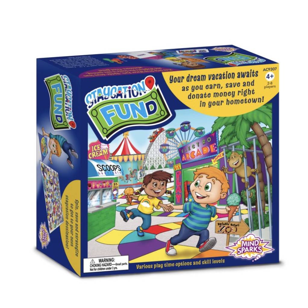 Fun vacation spots await you right in your own hometown! Roll the dice and travel around the colorful game board earning, saving and donating money. Visit the aquarium, the pet store, stop for ice cream, catch a movie and hit the arcade in this exciting, adventure-filled game. Mind Sparks® Staycation FUNd™ teaches children the value of money, as well as math and decision-making skills. Play with up to eight players in your home or classroom. Game board measures 18" x 18" and features 15 fun destinations. Box contents include eight pawns, one spinner, two dice, eight destination tracker dry erase boards, four dry erase markers, 30 destination cards, 40 pieces of money in each denomination ($1, $5, $10, $20, $50, $100), 24 bonus chips, eight savings pouches, one donations pouch, 40 color cards and an instruction sheet. Ideal for ages 4+.