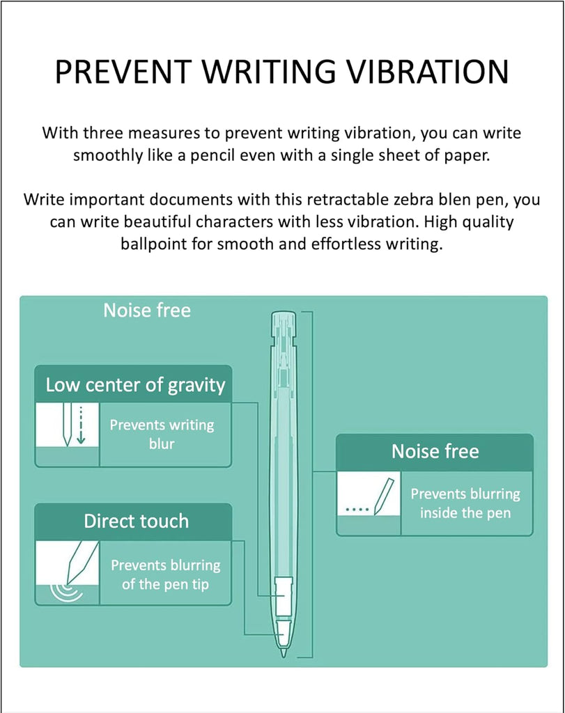 The Zebra bLen pen provides an innovative vibration-free writing experience. It is designed with a gap-free internal system to reduce noise and a brass weight at the tip to lower the center of gravity. These characteristics remove uncomfortable writing vibration and make the pen more stable and easier to control. Created in collaboration with Nendo, a Japanese design studio, the bLen gel pen is not only sleek in appearance but puts an end to stressful writing.